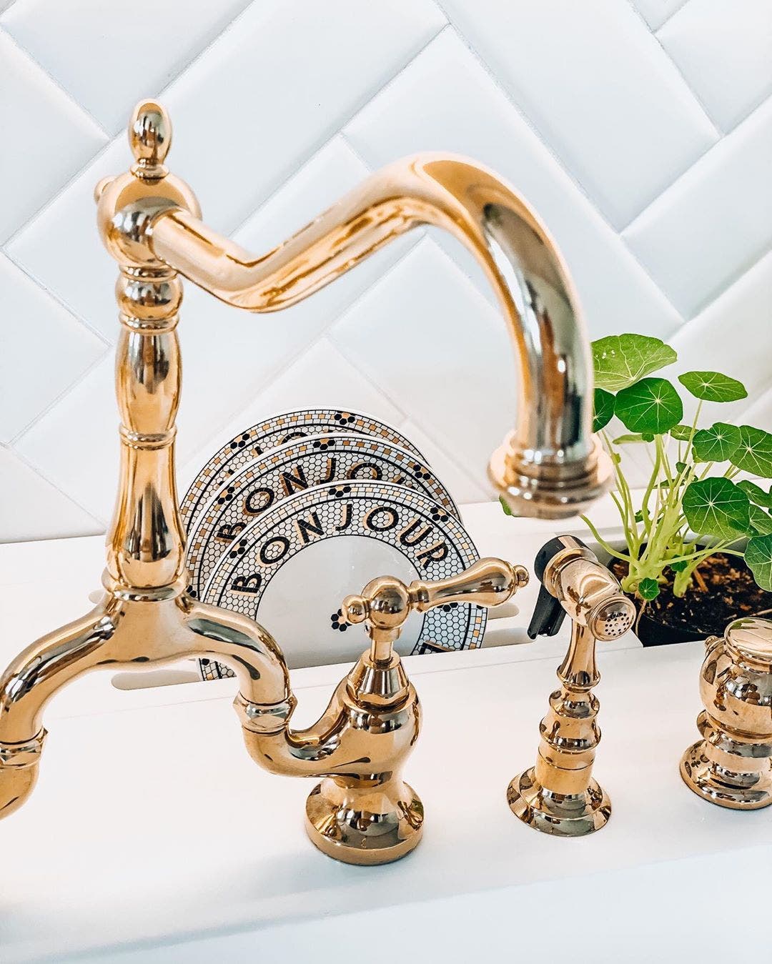 A polished brass bridge kitchen faucet is the optimal choice when creating a vintage appearance. The classic style of brass paired with the traditional look of a bridge faucet pairs well with farmhouse kitchen sinks and other basin styles. Brass is also a low-maintenance finish.