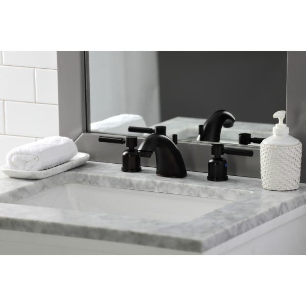 | Bold and edgy in design, Kingston’s oil rubbed bronze Mini-Widespread Faucet, FB8955DL, is the perfect fit for you and your bathroom. |