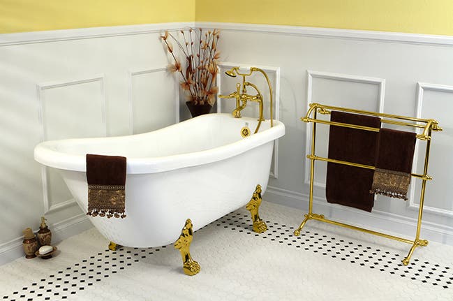 To complete your vintage bath you need matching faucets. Old World styles often use freestanding fixtures that call attention to the plumbing. This hardware glistens because it is finished in polished chrome, antique brass or oil-rubbed bronze.