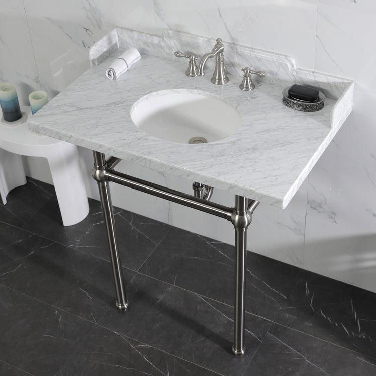 Kingston Heirloom LMS36MB8 - Pemberton 36-Inch Carrara Marble Console Sink with Brass Legs (8-Inch, 3-Hole), Carrara Marble White/Brushed Nickel