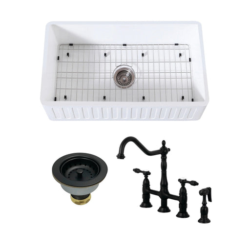 Kingston BrassKingston Brass Kitchen Sink Combo - Arcticstone 30-Inch White Stone Single Bowl Farmhouse Kitchen Sink with Deck Mount Bridge Kitchen Faucet with B...