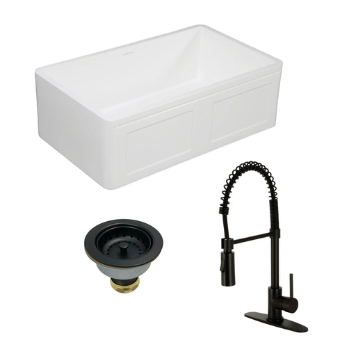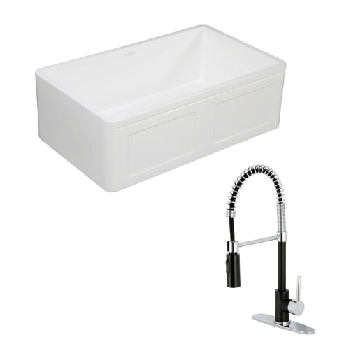 KINGSTON BrassKingston Brass Kitchen Sink Combo - Arcticstone 33-Inch White Stone Single Bowl Farmhouse Kitchen Sink with Deck Mount Bridge Kitchen Faucet with S...