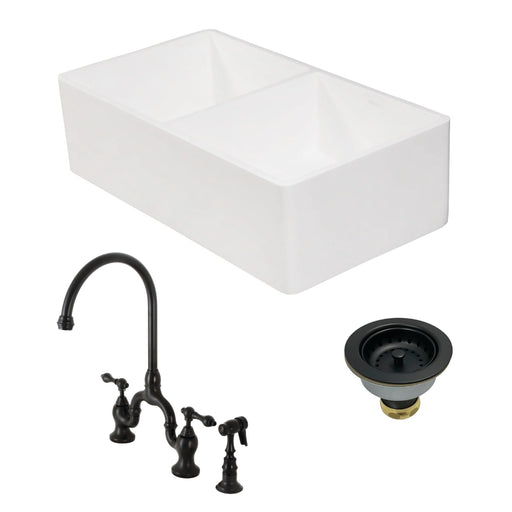 KINGSTON BrassKingston Brass Kitchen Sink Combo - Arcticstone 33-Inch White Stone Double Bowl Farmhouse Kitchen Sink with Deck Mount Bridge Kitchen Faucet with S...