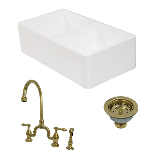 Original price $2,159.85 - Original price $2,159.85Original price $2,159.85$2,623.70$2,623.70 - $2,623.70Current price $2,623.70| /Arcticstone 33-Inch White Stone Double Bowl Farmhouse Kitchen Sink with Deck Mount Bridge Kitchen Faucet with Side Sprayer and Basket Strainer, Polished Brass