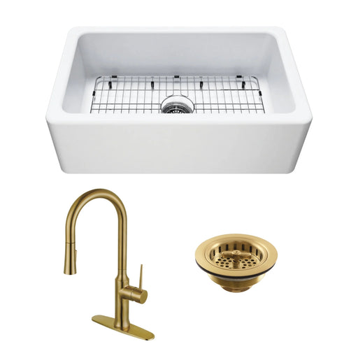 Original price $1,301.90 - Original price $1,301.90Original price $1,301.90$1,571.25$1,571.25 - $1,571.25Current price $1,571.25| /Kaolin 30-Inch Ceramic Single Bowl Farmhouse Kitchen Sink with Bottom Grid and Strainer with Deck Mount Kitchen Faucet with Brass Side Sprayer and Basket Strainer, Brushed Brass