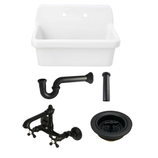 KINGSTON BrassKingston Brass Kitchen Sink Combo - Doriteal 30-Inch Ceramic Wall Mount Utility Sink with Wall-Mount Bridge Kitchen Faucet and Basket Strainer, Bru...
