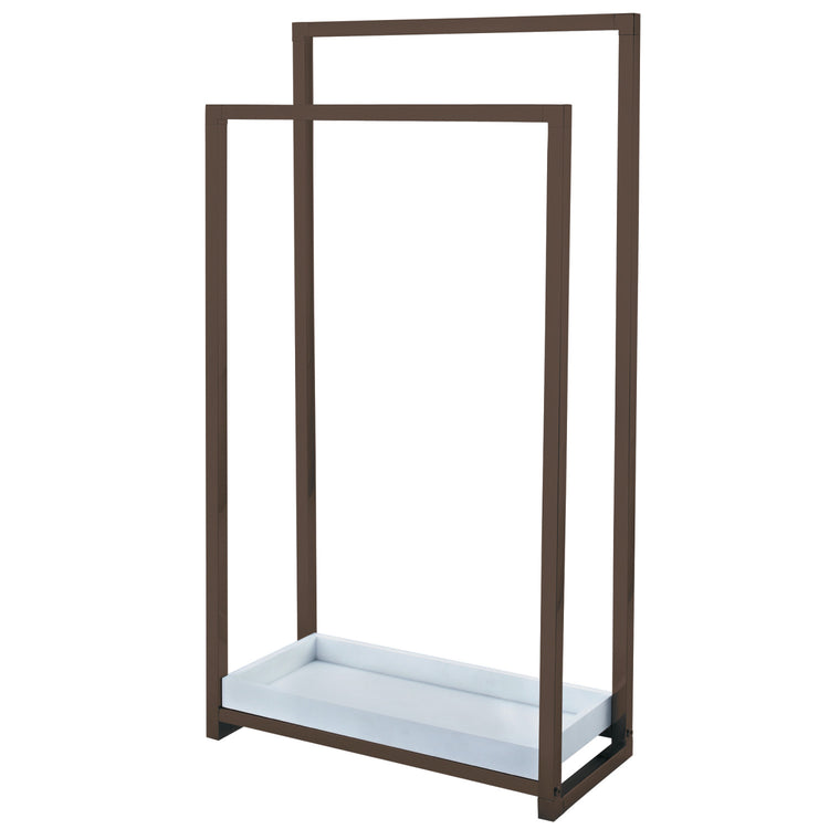 This contemporary styled pedestal towel rack is stylish yet functional. The 2-tiers provide enough room to hang hand and bath towels from and the included wooden case acts as an additional storage area for additional bathroom accessories. With a large base, the towel rack is built to be sturdy without the need to worry about it tipping over. Constructed from steel, many years of use can be expected.