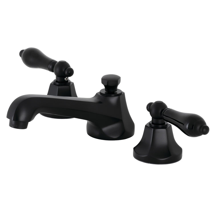 Crafted in commendations to English nobility, the exemplary design of this faucet manifests regality and elegance with its black porcelain handles. Ideal for more spacious bathrooms, widespread faucets are more spread apart and feature a 3-hole installation. The Duchess widespread bathroom faucet with brass pop-up and its featured sturdy brass construction and premium matte black finish are guaranteed to glamorize your home's modern ensemble for years to come. Glamorize your home today with the traditional elegance of this faucet. A matching finish drain is also included.