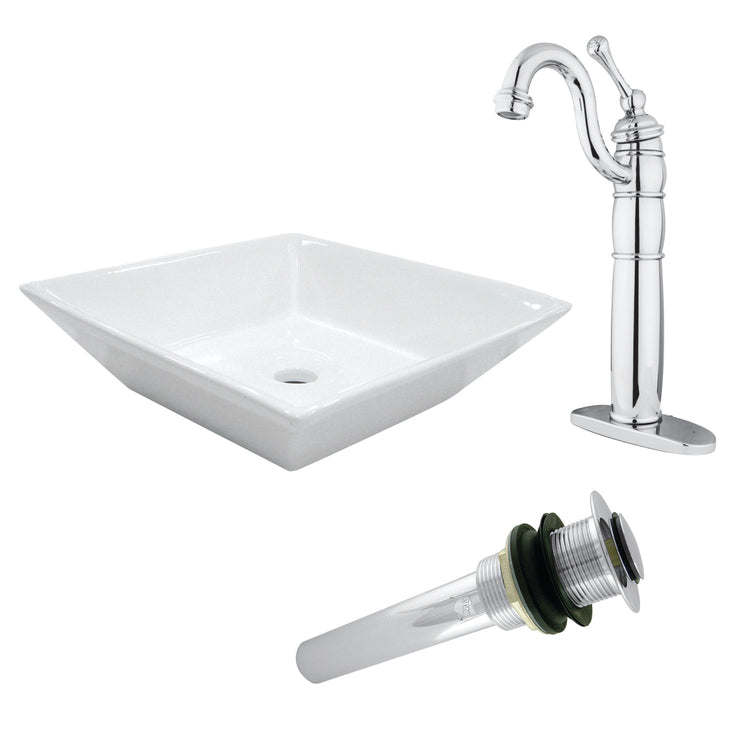 Kingston Perfection EV4256B1421 16-9/16 Inch Ceramic Square Vessel Sink with Heritage Sink Faucet and Drain Combo, White/Polished Chrome