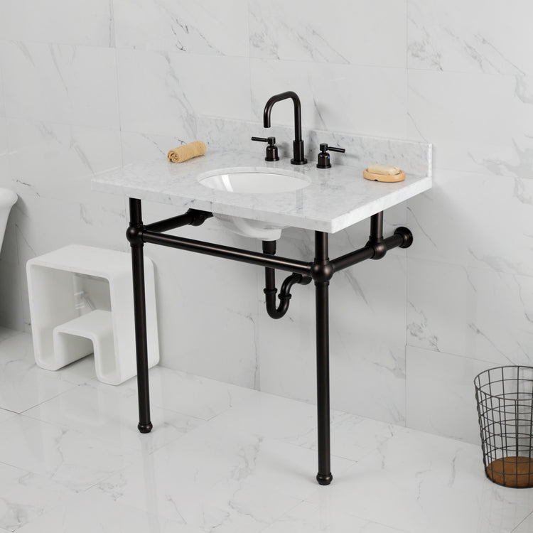 Kingston Heirloom KVBH3622M85 - Templeton 36-Inch Carrara Marble Console Sink with Brass Legs (8-Inch, 3-Hole), Carrara Marble White/Oil Rubbed Bronze