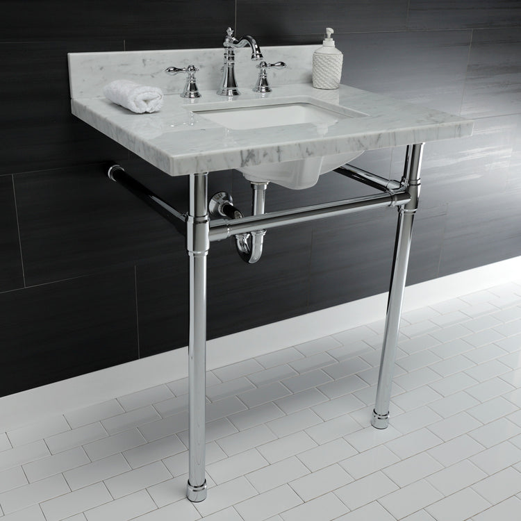 Kingston Tulare KVPB30M8SQ1ST - Dreyfuss 30-Inch Carrara Marble Vanity Top with Stainless Steel Legs (8-Inch, 3-Hole), Carrara Marble White/Polished Chrome