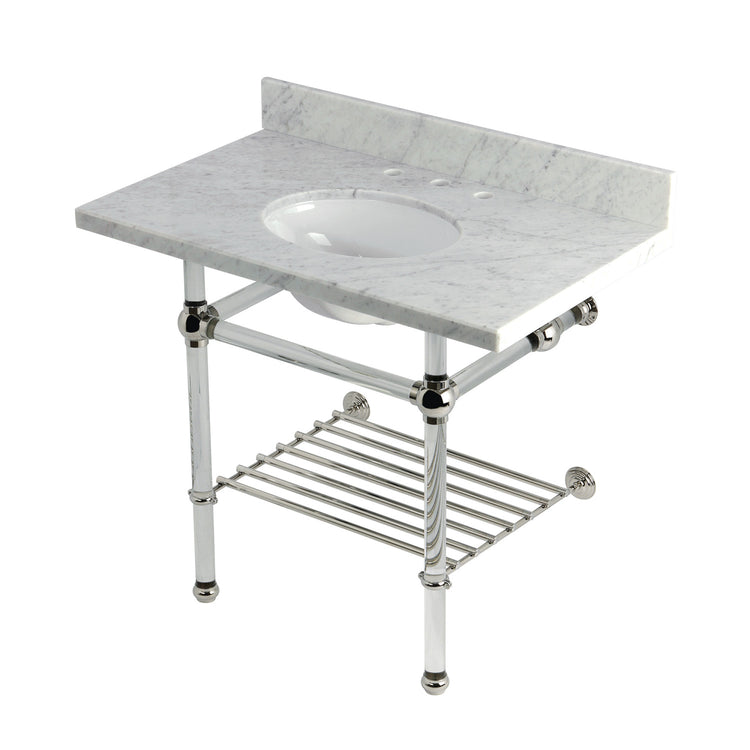 Kingston Tulare KVPB3630MAB6 - Templeton 36-Inch Carrara Marble Console Sink with Acrylic Legs and Shelf (8-Inch, 3-Hole), Carrara Marble White/Polished Nickel