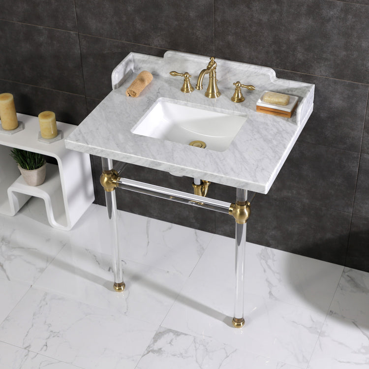 Kingston Tulare LMS3030MASQ7 - Pemberton 30-Inch Carrara Marble Console Sink with Acrylic Legs (8-Inch, 3-Hole), Carrara Marble White/Brushed Brass