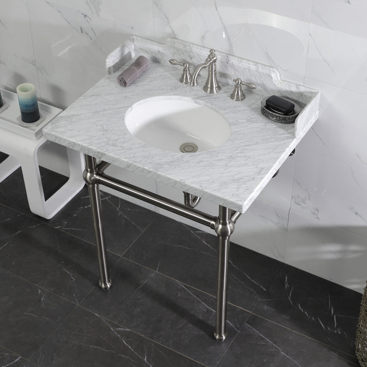 Kingston Heirloom LMS3030MB8 - Pemberton 30-Inch Carrara Marble Console Sink with Brass Legs (8-Inch, 3-Hole), Carrara Marble White/Brushed Nickel