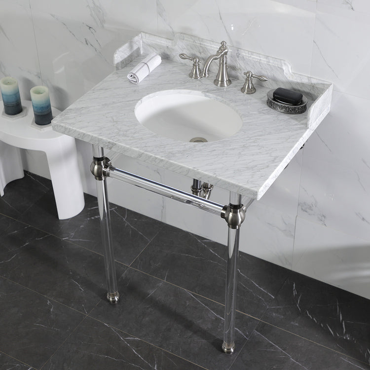 Kingston Tulare LMS30MA8 - Pemberton 30-Inch Carrara Marble Console Sink with Acrylic Legs (8-Inch, 3-Hole), Carrara Marble White/Brushed Nickel