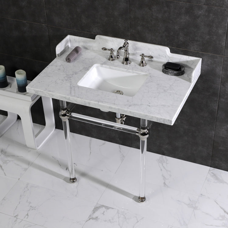 Kingston Tulare LMS3630MASQ6 - Pemberton 36-Inch Carrara Marble Console Sink with Acrylic Legs (8-Inch, 3-Hole), Carrara Marble White/Polished Nickel