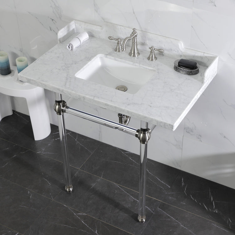 Kingston Tulare LMS36MASQ8 - Pemberton 36-Inch Carrara Marble Console Sink with Acrylic Legs (8-Inch, 3-Hole), Carrara Marble White/Brushed Nickel
