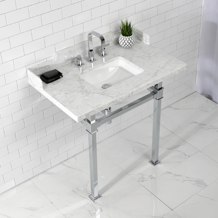 Kingston Sona LMS36MSQ1 - Viceroy 36-Inch Carrara Marble Console Sink with Stainless Steel Legs (8-Inch, 3-Hole), Carrara Marble White/Polished Chrome