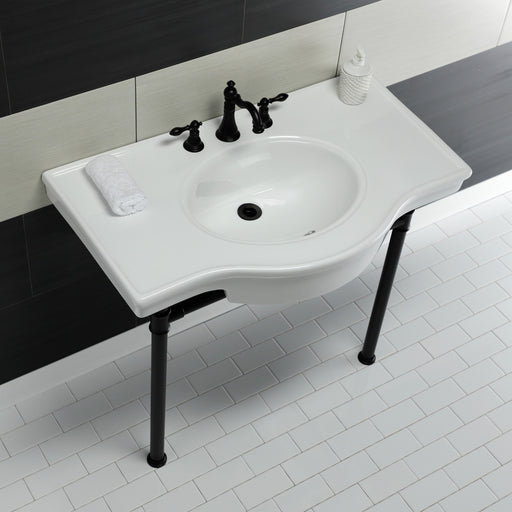 Original price $1,929.85Original price $1,929.85 - Original price $1,929.85Original price $1,929.85Current price $1,447.39$1,447.39 - $1,447.39Current price $1,447.39| /Kingston Tulare KVPB37227W80 - Dreyfuss 37-Inch Ceramic Console Sink with Stainless Steel Legs (8-Inch, 3-Hole), White/Matte Black