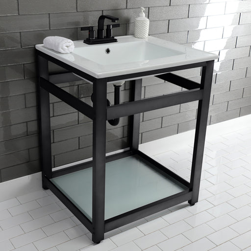 Original price $1,109.85Original price $1,109.85 - Original price $1,109.85Original price $1,109.85Current price $832.39$832.39 - $832.39Current price $832.39| /Kingston Quadras VWP2522W4B0 25-Inch Ceramic Console Sink with Steel Base and Glass Shelf (4-Inch, 3-Hole), White/Matte Black