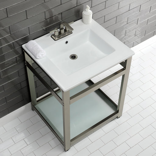 Kingston BrassKingston Quadras VWP2522W4B8 25-Inch Ceramic Console Sink with Steel Base and Glass Shelf (4-Inch, 3-Hole), White/Brushed Nickel Exquisitely sty...