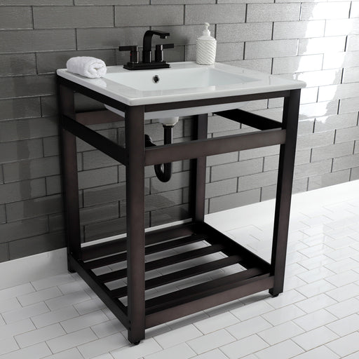 Kingston BrassKingston Sona VWP2522W4A5 - Quadras 25-Inch Ceramic Console Sink with Steel Base and Shelf (4-Inch, 3-Hole), White/Oil Rubbed Bronze Exquisitely...