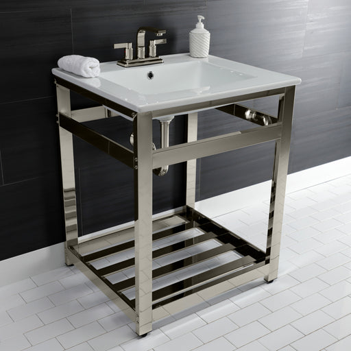 Original price $959.85Original price $959.85 - Original price $959.85Original price $959.85Current price $719.89$719.89 - $719.89Current price $719.89| /Kingston Sona VWP2522W4A6 - Quadras 25-Inch Ceramic Console Sink with Steel Base and Shelf (4-Inch, 3-Hole), White/Polished Nickel