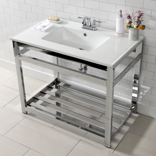 Kingston BrassKingston Quadras VWP3722W4A1 37-Inch Ceramic Console Sink with Steel Base and Shelf (4-Inch, 3-Hole), White/Polished Chrome Exquisitely styled f...