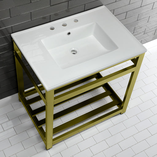 Kingston BrassKingston Sona VWP3122W8A7 - Quadras 31-Inch Ceramic Console Sink with Steel Base and Shelf (8-Inch, 3-Hole), White/Brushed Brass Exquisitely sty...