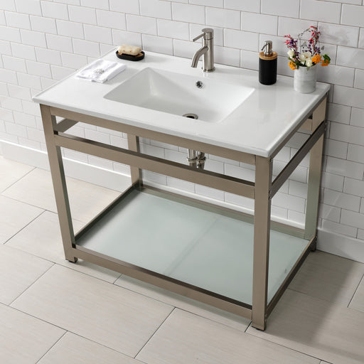 Original price $1,539.90Original price $1,539.90 - Original price $1,539.90Original price $1,539.90Current price $1,154.93$1,154.93 - $1,154.93Current price $1,154.93| /Kingston Quadras VWP3722B8 37-Inch Ceramic Console Sink with Steel Base and Glass Shelf (1-Hole), White/Brushed Nickel