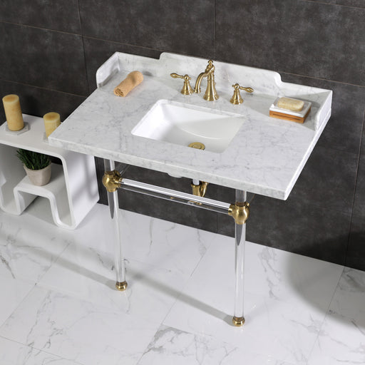 Original price $3,079.90Original price $3,079.90 - Original price $3,079.90Original price $3,079.90Current price $2,309.93$2,309.93 - $2,309.93Current price $2,309.93| /Kingston Tulare LMS3630MASQ7 - Pemberton 36-Inch Carrara Marble Console Sink with Acrylic Legs (8-Inch, 3-Hole), Carrara Marble White/Brushed Brass