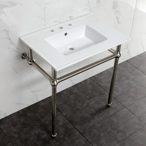 Original price $1,659.90Original price $1,659.90 - Original price $1,659.90Original price $1,659.90Current price $1,244.93$1,244.93 - $1,244.93Current price $1,244.93| /Kingston Heirloom KVBH31227W8B8 - Templeton 31-Inch Ceramic Console Sink with Brass Legs (8-Inch, 3-Hole), White/Brushed Nickel