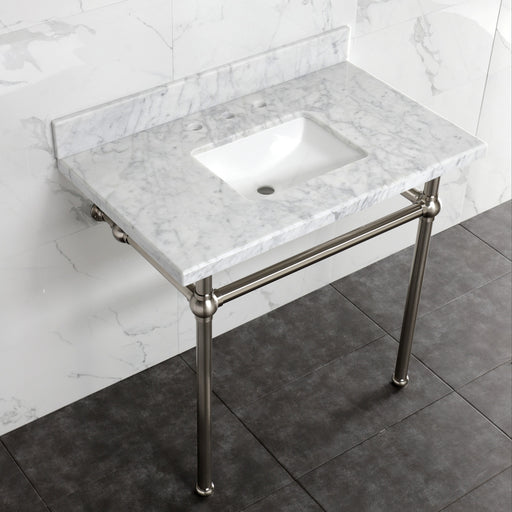 Original price $2,144.90 - Original price $2,144.90Original price $2,144.90$2,144.90$2,144.90 - $2,144.90Current price $2,144.90| /Kingston Heirloom KVBH3622M88 - Templeton 36-Inch Carrara Marble Console Sink with Brass Legs (8-Inch, 3-Hole), Carrara Marble White/Brushed Nickel