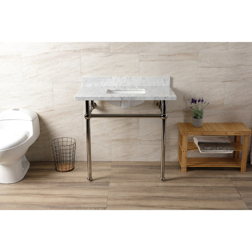 Original price $2,244.90 - Original price $2,244.90Original price $2,244.90$2,244.90$2,244.90 - $2,244.90Current price $2,244.90| /Kingston Heirloom KVBH3622M8SQ6 - Templeton 36-Inch Carrara Marble Console Sink with Brass Legs (8-Inch, 3-Hole), Carrara Marble White/Polished Nickel