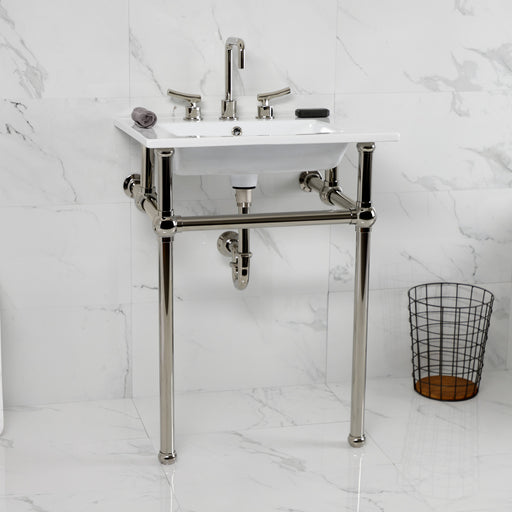 Original price $1,704.90Original price $1,704.90 - Original price $1,704.90Original price $1,704.90Current price $1,278.68$1,278.68 - $1,278.68Current price $1,278.68| /Kingston Heirloom KVBH25227W8B6 - Templeton 25-Inch Ceramic Console Sink with Brass Legs (8-Inch, 3-Hole), White/Polished Nickel