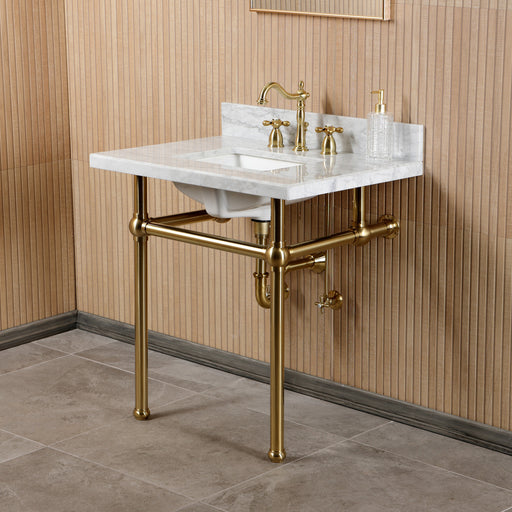 Original price $2,984.75 - Original price $2,984.75Original price $2,984.75$2,984.75$2,984.75 - $2,984.75Current price $2,984.75| /Kingston Heirloom CKVPB3030MBSQ7 - Templeton 30-Inch Carrara Marble Console Sink Set with Widespread Bathroom Faucet and Plumbing Trim Kit (8-Inch, 3-Hole), Carrara Marble White/Brushed Brass