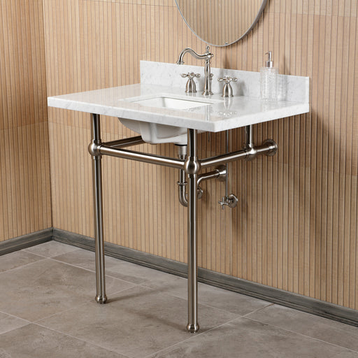 Original price $2,664.75 - Original price $2,664.75Original price $2,664.75$2,664.75$2,664.75 - $2,664.75Current price $2,664.75| /Kingston Heirloom CKVPB3030MBSQ8 - Templeton 30-Inch Carrara Marble Console Sink Set with Widespread Bathroom Faucet and Plumbing Trim Kit (8-Inch, 3-Hole), Carrara Marble White/Brushed Nickel