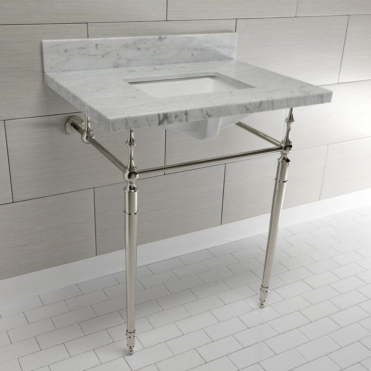 Edwardian KVPB3022M8SQ6 30-Inch Carrara Marble Console Sink with Brass Legs (8-Inch, 3-Hole), Carrara Marble White/Polished Nickel
