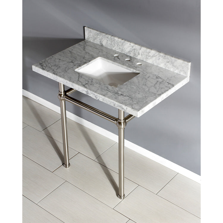 Kingston Heirloom KVPB36MBSQ8 - Templeton 36-Inch Carrara Marble Vanity Top with Brass Legs (8-Inch, 3-Hole), Carrara Marble White/Brushed Nickel