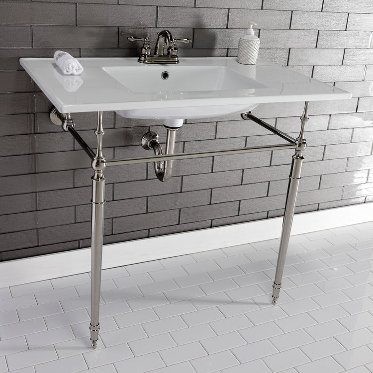 Edwardian KVPB37227W4PN 37-Inch Ceramic Console Sink with Brass Legs (4-Inch, 3-Hole), White/Polished Nickel