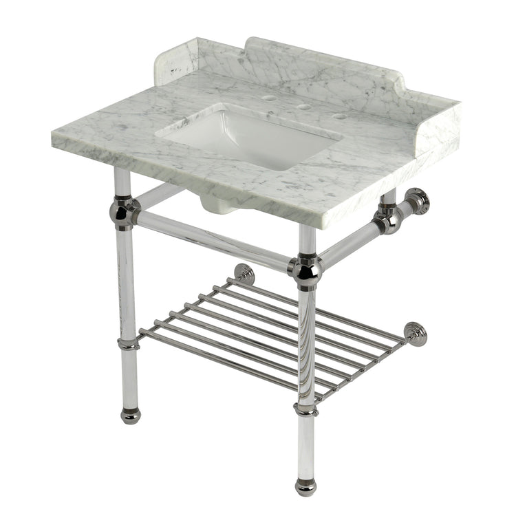 Kingston Tulare LMS3030MASQB6 - Pemberton 30-Inch Carrara Marble Console Sink with Acrylic Legs and Shelf (8-Inch, 3-Hole), Carrara Marble White/Polished Nickel