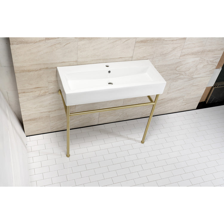 New Haven VPB39177ST 39-Inch Porcelain Console Sink with Stainless Steel Legs (1-Hole), White/Brushed Brass