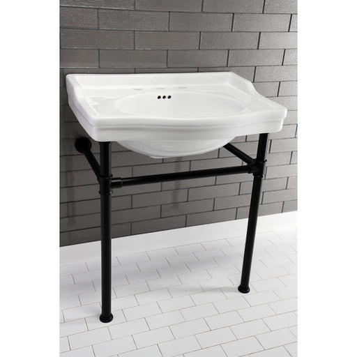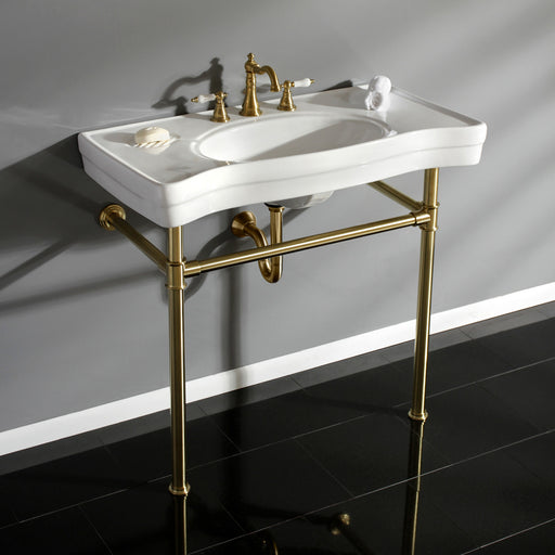 Kingston BrassVictorian VPB33087ST 30-Inch Ceramic Console Sink with Stainless Steel Legs (8-Inch, 3-Hole), White/Brushed Brass With a beautiful ceramic count...