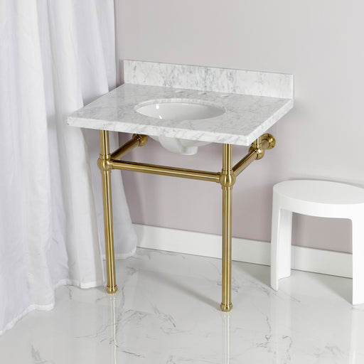 Kingston BrassTempleton KVPB30MBSQ7 30-Inch Carrara Marble Vanity Top with Brass Legs (8-Inch, 3-Hole), Carrara Marble White/Brushed Brass With a beautiful Ca...