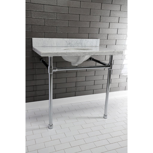 Kingston BrassKingston Sona VWP3122W8A6 - Quadras 31-Inch Ceramic Console Sink with Steel Base and Shelf (8-Inch, 3-Hole), White/Polished Nickel Exquisitely s...