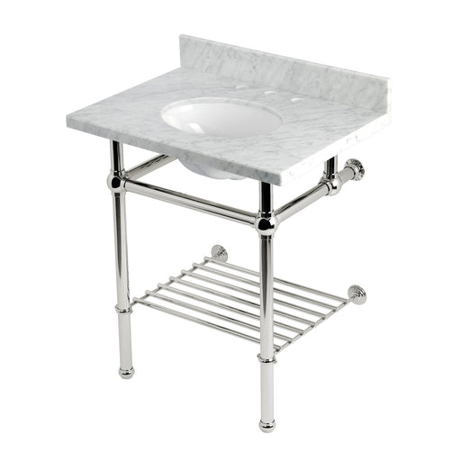 Kingston BrassTempleton KVPB30MBB6 30-Inch Carrara Marble Console Sink with Brass Legs and Shelf (8-Inch, 3-Hole), Carrara Marble White/Polished Nickel With a...