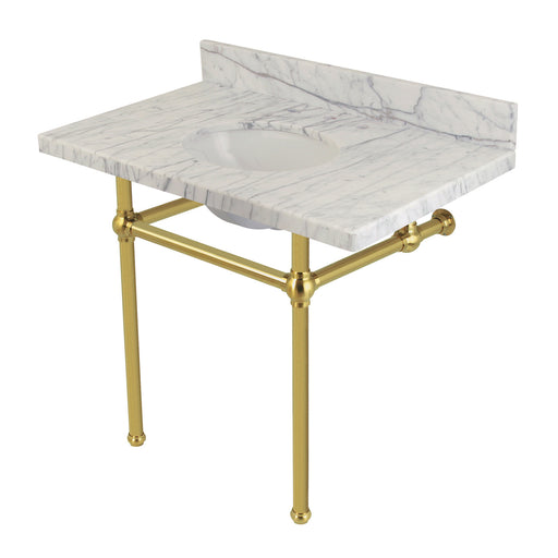 Kingston BrassTempleton KVPB3630MB7 36-Inch Carrara Marble Vanity Top with Brass Legs (8-Inch, 3-Hole), Carrara Marble White/Brushed Brass With a beautiful Ca...