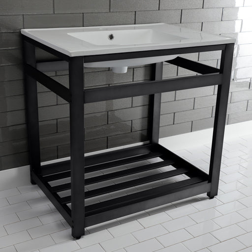 Kingston BrassQuadras VWP3122A0 31-Inch Ceramic Console Sink with Steel Base and Shelf (1-Hole), White/Matte Black Exquisitely styled for your contemporary ta...