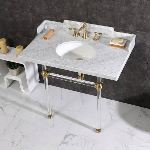 Kingston BrassPemberton LMS3630MA7 36-Inch Carrara Marble Console Sink with Acrylic Legs (8-Inch, 3-Hole), Carrara Marble White/Brushed Brass With a beautiful...