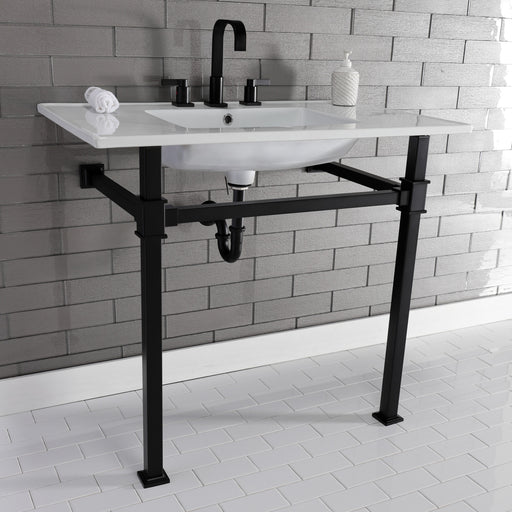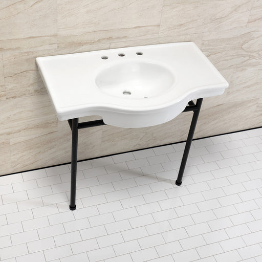 Kingston BrassMonarch KVPB37228Q0 37-Inch Ceramic Console Sink with Stainless Steel Legs (8-Inch, 3-Hole), White/Matte Black With a beautiful ceramic counter ...